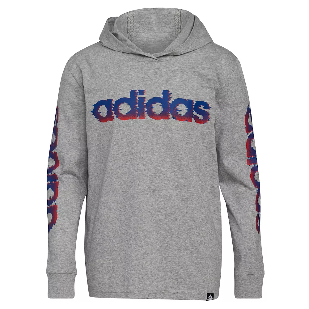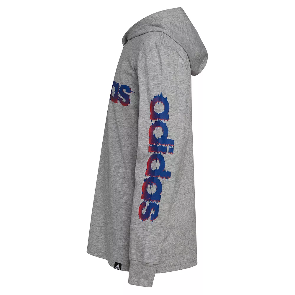 Layer his look with this soft and sporty boys’ adidas glitchy hooded graphic tee.
