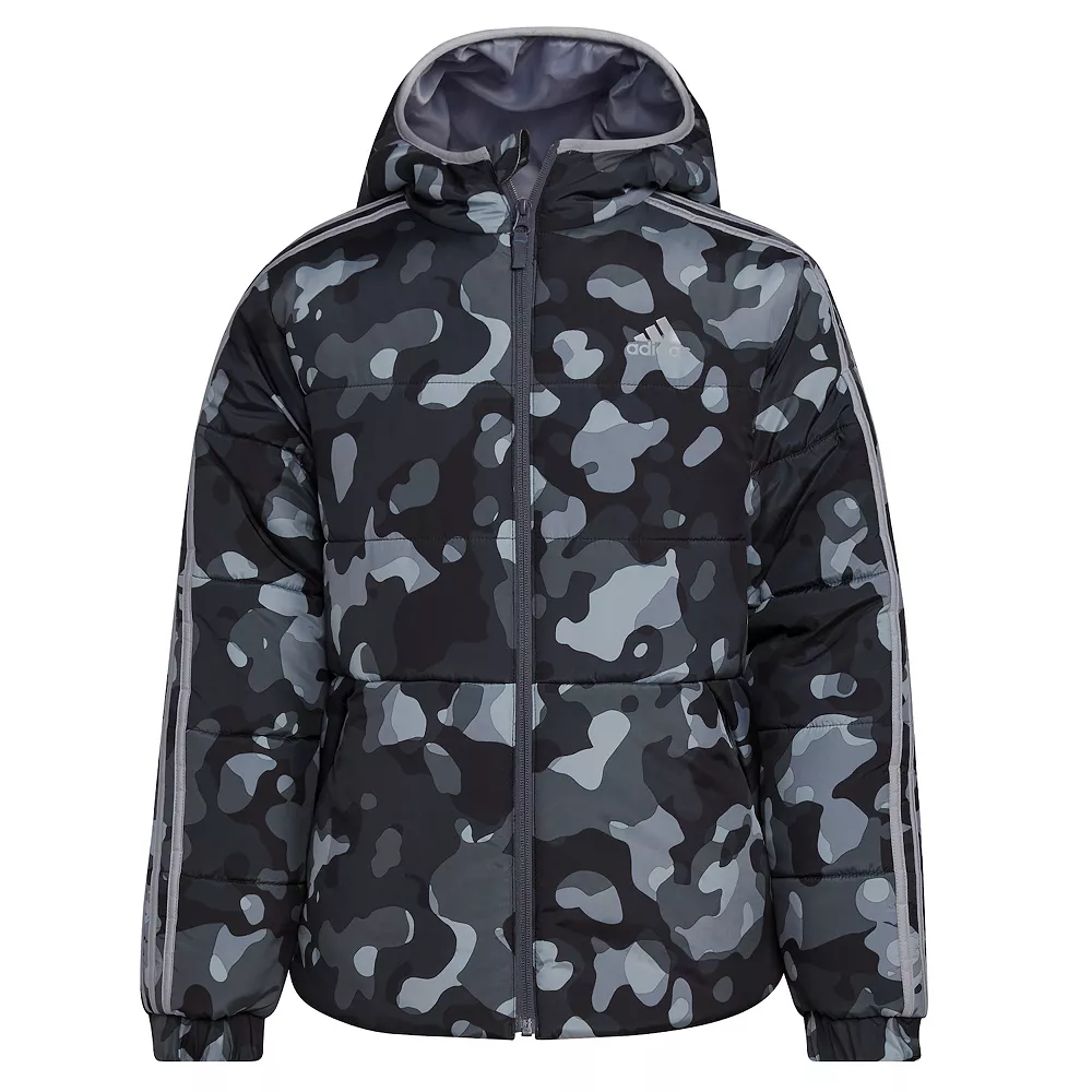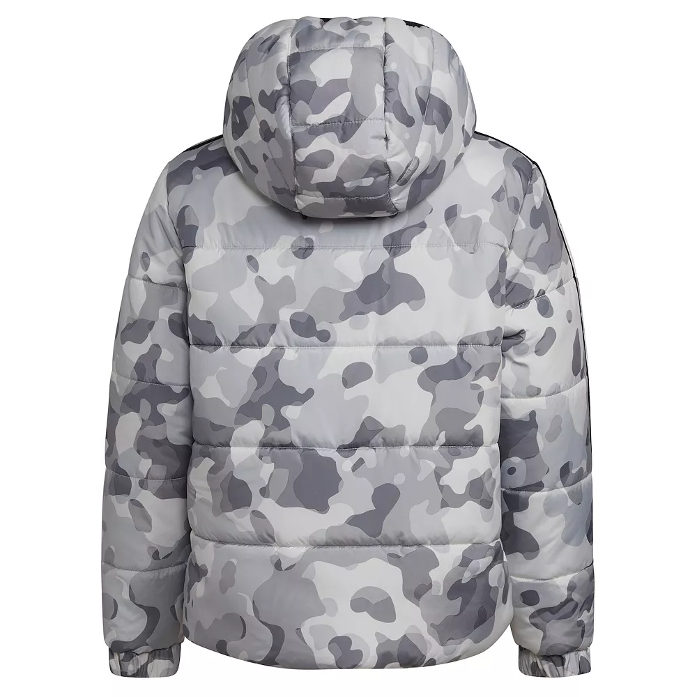 Gear him up for cold-weather adventures big and small. This boys’ puffer jacket couldn’t be more cozy. It’s insulated to make it extra warm and coated to be water-resistant. He’ll have extra coverage since it’s a little longer in back. Allover camouflage and adidas 3-Stripes bump up his style.
